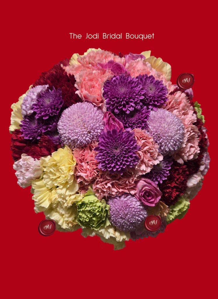 The Jodi Bridal Bouquet is a vibrant and textured arrangement with a rich mix of colors and floral elements. It has a full, rounded shape and a somewhat romantic feel.